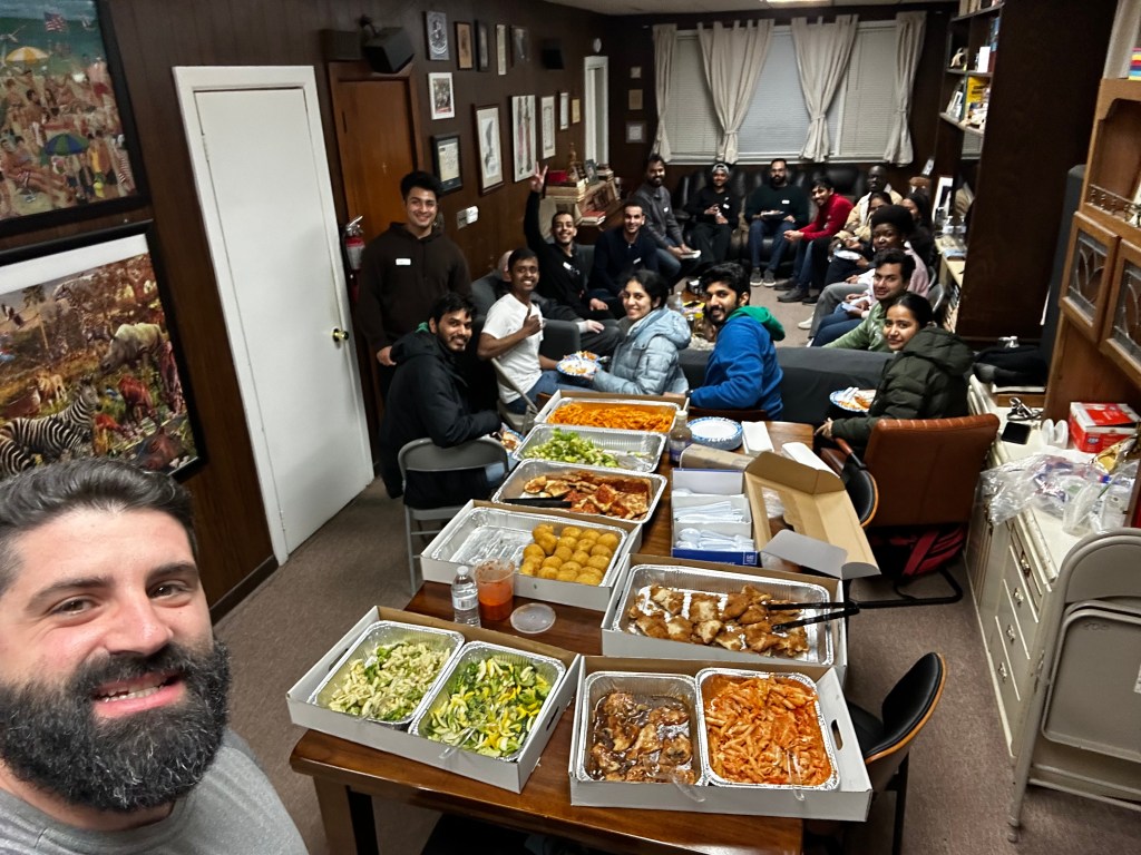 The next week we had another opportunity to see God work. For our home groups on Friday 3/14, we needed a new location for the group Jenn and I usually host at our home. Praise God He once again showed He was in control. A former professor, and founder of a partner student ministry on campus, affectionately known as “MAZ,” opened his home in Hoboken for us. In fact, we were able to fit even more than our usual 8-10 students; 16 students came out ! We had delicious Italian food and a lively discussion on “purpose and eternity,” where we once again share the scriptures and the gospel with our students.